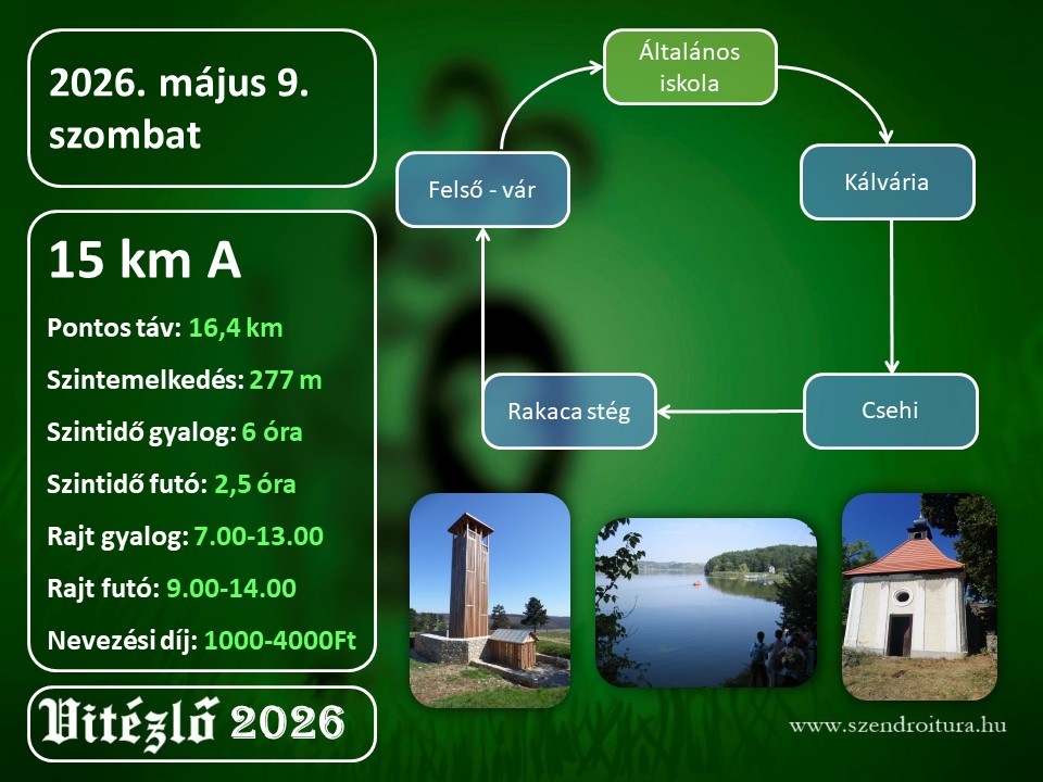 Szendrőt és a környező mezőgazdasági tevékenységet nagyon jól bemutatja ez az útvonal, valamint rápillanthatunk még a Rakaca víztározóra is. Ezen a távon van természeti és építészeti érdekesség egyaránt. Szintben nem kevés, de leküzdhetőek az akadályok. Rajt után a közelmúltban felújított Kálváriához vezet az első állomás, ahonnan Pazar panoráma tárul Szendrőre. Azt követően a Bódva part gátján hagyjuk el Szendrőt és érkezünk meg az Agroszan Bt. mezőgazdasági telephelyére. Itt a Bódva-völgyi Pálinkaház előtt lesz a következő állomás. Egyik mezőgazdasági telepről haladunk a következőre, a Csehi pusztára, ahol éppen az állattartó farm felújítása folyik. Hangulatos, nem túl régen felújított harangláb hirdeti a Csehi tanya múltját. Ezt követően emelkedő, és irány a Rakaca víztározó gátja. A gát előtt egy kerítéssel elzárt területre kell besétálni, és közvetlenül a tó partján, a kenu stégnél lesz az ellenőrző pont. Innen visszafelé haladunk Csehi irányában, de nem kell visszaereszkedni a tanyára, hanem menni tovább Szendrő irányába. Itt jön a túra legnehezebb része, felmászni a Felső-Vár kilátóhoz. A kilátás kárpótolni fog minden túrázót. Vissza lehet tekinteni az első állomáspontra a Kálváriára és megnézni a következő ellenőrző pontot, a Református harangtornyot, illetve az egész Bódva – völgyére lesz egy remek rálátás. Szép idő esetében az Aggteleki Nemzeti Park határát a Korlát-hegyet is szemügyre vehetjük, tiszta idő esetén a Tátra sziluettje is megfigyelhető. Ezt követően leereszkedünk a Fő térre és az 1520-as években épült református harangtoronyhoz érünk. A református egyházközösség jóvoltából különleges lehetősége lesz a túrázóknak, hiszen a harangtorony fagalériás, hegyes sisakos tetőzetébe fel lehet sétálni. A harangtorony belseje igazi középkori hangulatot idéz, látványa valóban egy vártorony képét tárja elénk. Innen továbbhaladunk a Csáky kastélyhoz. A kastély kertjében az OCR akadálypályát tudják kipróbálni az általános- és középiskolás diákok. A felnőttek eközben megcsodálhatják a kastélyt és a hozzá kapcsolódó melléképületeket. Ezen a viszonylag rövid, 15 km-es távon belül: középkori kápolna, várromok, harangtorony és kastély, valamint két mezőgazdasági üzem és egy meseszép mesterséges víztározó. Ennyi élményt belesűríteni egy ilyen rövid kirándulásba nem mindenhol lehet. Ezt a távot bátran ajánljuk mindenkinek, mert nagy élményben lesz része a teljesítőknek!