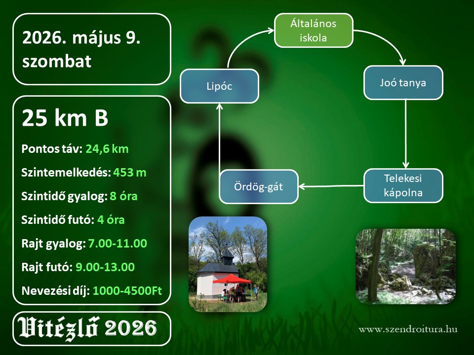 Az első állomáspontja a túrának a Szendrő főterén lévő 1520-as években épült református harangtoronyhoz. A református egyházközösség jóvoltából különleges lehetősége lesz a túrázóknak, hiszen a harangtorony fagalériás, hegyes sisakos tetőzetébe fel lehet sétálni. A harangtorony belseje igazi középkori hangulatot idéz, látványa valóban egy vártorony képét tárja elénk. Innen továbbhaladunk a Csáky kastélyhoz. A kastély kertjében az OCR akadálypályát tudják kipróbálni az általános- és középiskolás diákok. A felnőttek eközben megcsodálhatják a kastélyt és a hozzá kapcsolódó melléképületeket. A túra a Bódva hídon átkelve a Joó tanya irányában folytatódik tovább. A Joó tanyán igazi vidéki fogadtatásban lesz részünk egy régi felújított tanyasi házban. A Joó tanyát követően nagyon kell figyelni. Az itiner szerint haladjunk! A túristaútvonal és a GEOGO alkalmazás is a turista jelzésen visz, de a Vitézlő túra kapcsán a kiszalagozott útvonalon lehet kicsit rövidíteni a távon. A szalagokat követve felkapaszkodunk a Kis-Hegy tetejére, ahol mindenképpen érdemes körbe nézni és megcsodálni a fantasztikus látványt, amit a Bódva – völgye és a Rudabányai hegység nyújt. Innen a Telekesi kápolna a cél, hol erdőben, hol bokros részeken, hangulatos ösvényeken haladva. Telekesi kápolnától a Lipóc ellenőrző pont a következő állomás. Innen lépünk be az Aggteleki Nemzeti Park területére. A Telekes patak völgyében, az Ördög-gátban a telekesi búvó patakot követjük, a szurdok végéig. Ott felkapaszkodunk a Korlát-hegyre és elsétálunk a Szendrői Természetjárók által létesített turista pihenőhöz. Innen az a varázslatos panoráma tárul mindenki elé, melyet a facebook oldalon is lehet látni a túra hirdetése kapcsán. A pihenőtől a Lipóc ellenőrző pont felé indulunk egy erdős szakaszon át. Ez az ellenőrző pont szokott mindig a legvidámabb hangulatú lenni. Innen már Szendrő felé vesszük az irányt, szép panoráma nyílik a településre. A cél előtt még a katolikus kálváriát is megtekintjük. Ez a túra talán a legtöbb természeti szépséget mutatja be, mindehhez 25 km szükséges csak sétálni. Jó szívvel ajánljuk azoknak, akik szeretnék az Ördög – gátat megnézni, és egy kicsit hosszabbat is sétálnának.