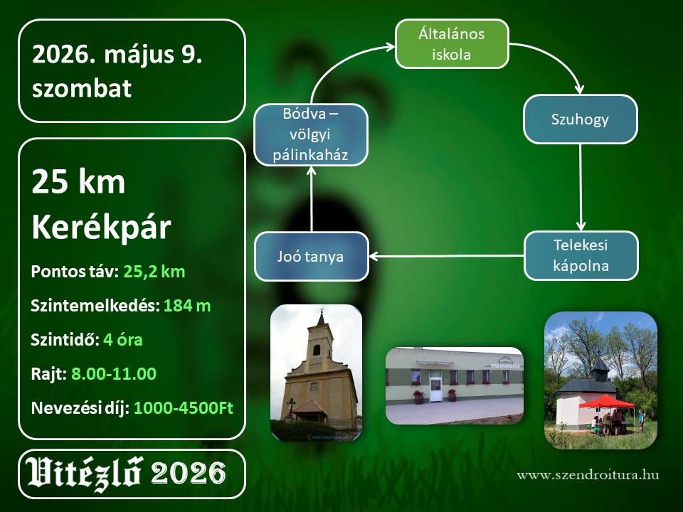 Idén a hagyományos Vitézlős kerékpártúrát szervezzük meg, egyéni rajtolással, sok ellenőrző ponttal. Az útvonal Szuhogy felé fog haladni, az első ellenőrző pont Szuhogy településen lesz. A hangulatos, rendezett, igazi vidéki takaros falucskánál szusszanjon mindenki egyet, mert onnan felfelé egy húzós emelkedőn jutunk el a Telekesi kápolnához. A hangulatos útmenti kápolnánál visszafordulunk és jövünk vissza Szendrő irányába, a Joó tanyán lesz a következő frissítés. A Joó tanyán mindenki megtapasztalhatja a vidéki vendégszeretetet egy csodálatosan felújított régi házban. Ezt követően Csehi pusztára visz ki az útvonal, ahol éppen az állattartó farm felújítása folyik. Hangulatos, nem túl régen felújított harangláb hirdeti a Csehi tanya múltját. Azt követően az egyik mezőgazdasági telepről haladunk a következőre. Szendrőre érkezünk meg az Agroszan Bt. mezőgazdasági telephelyére. Itt a Bódva-völgyi Pálinkaház előtt lesz a következő állomáspont. Innen már csak be kell gurulni a célba. Teljesen kezdő kerékpárosoknak is ajánljuk ezt az útvonalat. Alacsony forgalmú utak, nem túl hosszú táv, változatos környezet, jó aszfalt minőség. Szóval bátran nyeregbe pattanhatnak kezdők, fiatal résztvevők akár országúti bringával is!
