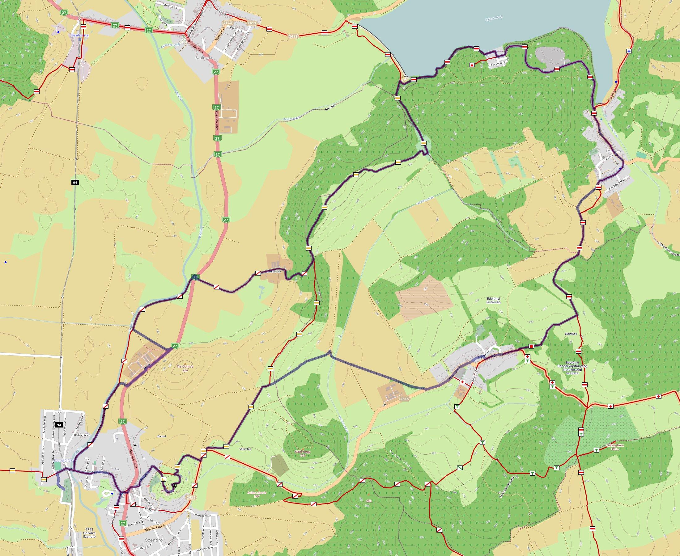 Szendrői Általános Iskola ⇒ Kálvária ⇒ Bódva part ⇒ Pálinkaház ⇒ Csehi puszta ⇒ Rakaca-tó gát ⇒ Meszes ⇒ Galvács ⇒ Felső-vár ⇒ Református harangtorony ⇒ Sportközpont ⇒ Szendrői Általános Iskola