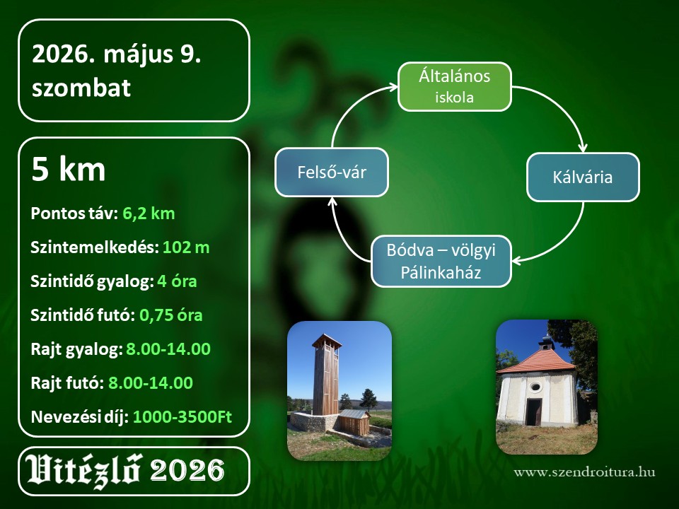 Egy valódi szeretnivaló útvonal. Nem túl hosszú és van benne sok érdekesség. Szintben bővelkedik, de leküzdhetőek az akadályok. Rajt után a közelmúltban felújított Kálváriához vezet az első állomás, ahonnan Pazar panoráma tárul Szendrőre. Azt követően a Bódva part gátján hagyjuk el Szendrőt és érkezünk meg az Agroszan Bt. mezőgazdasági telephelyére. Itt a Bódva-völgyi Pálinkaház előtt lesz a következő állomás. Mezőn haladunk tovább Galvács irányába tovább a Várdomb alá. Itt jön a túra legnehezebb része, felmászni a Felső-Vár kilátóhoz. A kilátás azonban kárpótolni fog mindenkit. Vissza lehet tekinteni az első állomáspontra a Kálváriára és megnézni a következő ellenőrző pontot, a Református harangtornyot, illetve az egész Bódva – völgyére lesz egy remek rálátás. Szép idő esetében az Aggteleki Nemzeti Park határát a Korlát- hegyet is szemügyre vehetjük, tiszta idő esetén a Tátra sziluettje is megfigyelhető. Ezt követően leereszkedünk a Fő térre és az 1520-as években épült református harangtoronyhoz érünk. A református egyházközösség jóvoltából különleges lehetősége lesz a túrázóknak, hiszen a harangtorony fagalériás, hegyes sisakos tetőzetébe fel lehet sétálni. A harangtorony belseje igazi középkori hangulatot idéz, látványa valóban egy vártorony képét tárja elénk. Innen továbbhaladunk a Csáky kastélyhoz. A kastély kertjében az OCR akadálypályát tudják kipróbálni az általános- és középiskolás diákok. A felnőttek eközben megcsodálhatják a kastélyt és a hozzá kapcsolódó melléképületeket. Ez a szendrői rövid táv: 5 kilométeren belül egy középkori kápolna, várromok, harangtorony és kastély. Ennyi élményt belesűríteni egy ilyen rövid kirándulásba nem mindenhol lehet. Ezt a távot bátran ajánljuk mindenkinek, mert nagy élményben lesz része a teljesítőknek!